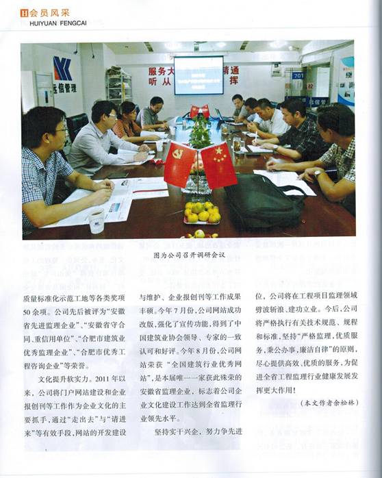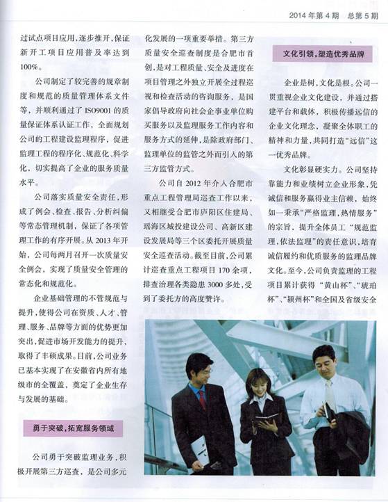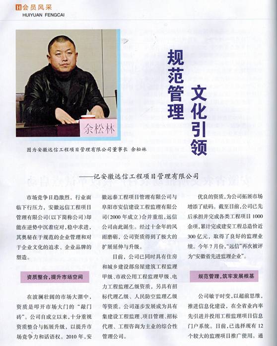 9月30日出版的《合肥招標投標雜志》(2014年第4期)重點刊發了公司董事長余松林撰寫的題為《規范管理 文化引領――安徽遠信工程項目管理有限公司》的專題文章,全面展示了公司發展成果,體現了企業的良好風貌,提升了企業形象和文化軟實力。文章分為資質整合提升市場空間、規范管理筑牢發展根基、勇于突破拓寬服務領域、文化引領塑造優秀品牌等四個篇章,全文如下: