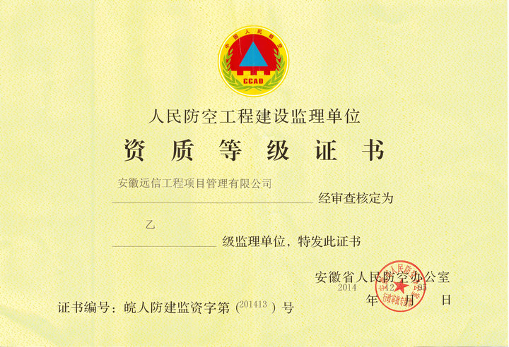 12月5日,公司申請(qǐng)的人民防空工程建設(shè)監(jiān)理乙級(jí)資質(zhì)順利通過(guò)省人民防空工程辦公室的審批,成功從丙級(jí)升級(jí)到乙級(jí)。取得該資質(zhì)后,我公司可承擔(dān)抗力等級(jí)5級(jí)及建筑面積2萬(wàn)平方米以下的人防工程監(jiān)理業(yè)務(wù)。
