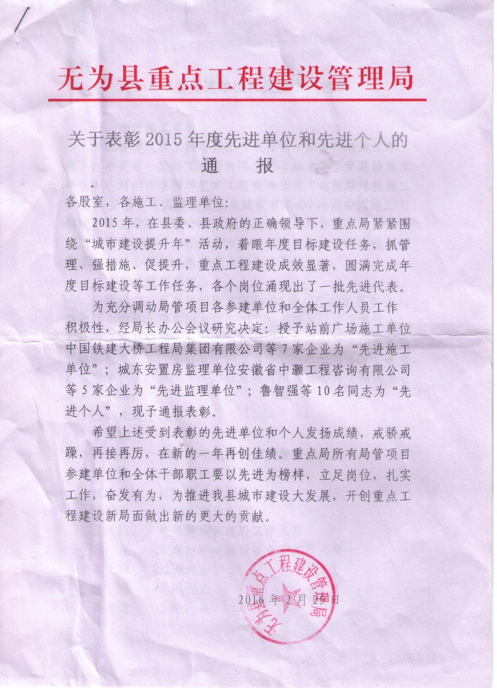 2月29日,無為縣重點工程建設(shè)管理局發(fā)布《關(guān)于表彰2015年度先進(jìn)單位和先進(jìn)個人的通報》,授予我公司“先進(jìn)監(jiān)理單位”稱號。