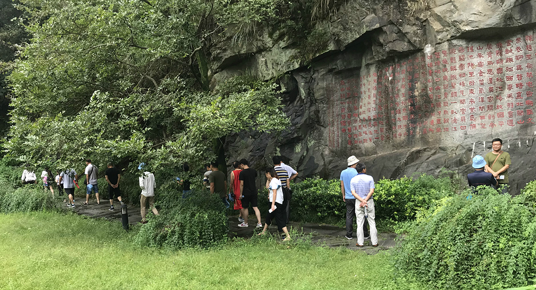 根據活動行程安排,大家首先到達位于天柱山腳下的石牛古洞景點參觀。據介紹,黃庭堅曾在此筑室讀書,景點內巖壁現存歷代文人墨客的詩文石刻三百余處。大家徘徊于青山綠水間,聽幽泉潺潺,觀巖壁石刻,親身感受了宜人的生態氧吧生活。