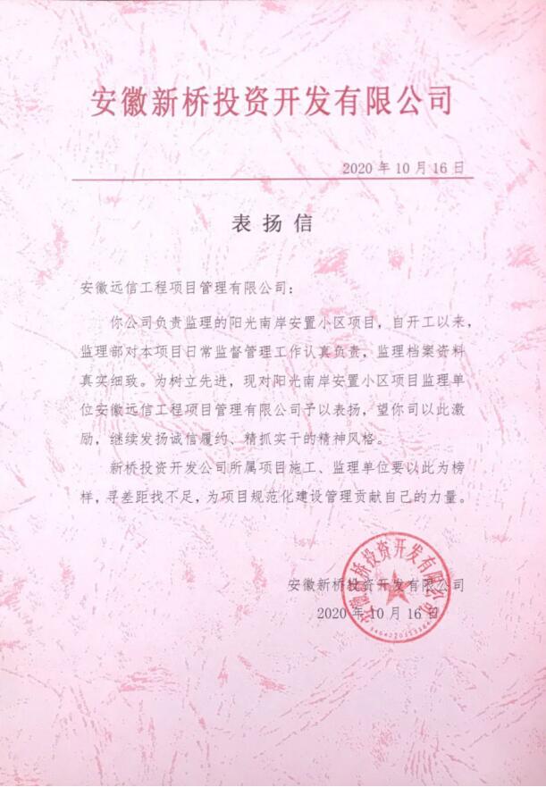 日前,陽光南岸安置小區(qū)項(xiàng)目監(jiān)理部收到業(yè)主發(fā)來的表揚(yáng)信。信中對項(xiàng)目監(jiān)理部自開工以來,日常監(jiān)督管理工作認(rèn)真負(fù)責(zé),監(jiān)理檔案資料真實(shí)細(xì)致的優(yōu)異表現(xiàn)給予了高度贊揚(yáng)。希望項(xiàng)目監(jiān)理部繼續(xù)發(fā)揚(yáng)誠信履約、精抓實(shí)干的精神風(fēng)格,同時(shí)號召全體新橋投資開發(fā)公司所屬項(xiàng)目施工、監(jiān)理單位向遠(yuǎn)信學(xué)習(xí),為項(xiàng)目規(guī)范化建設(shè)管理貢獻(xiàn)力量。