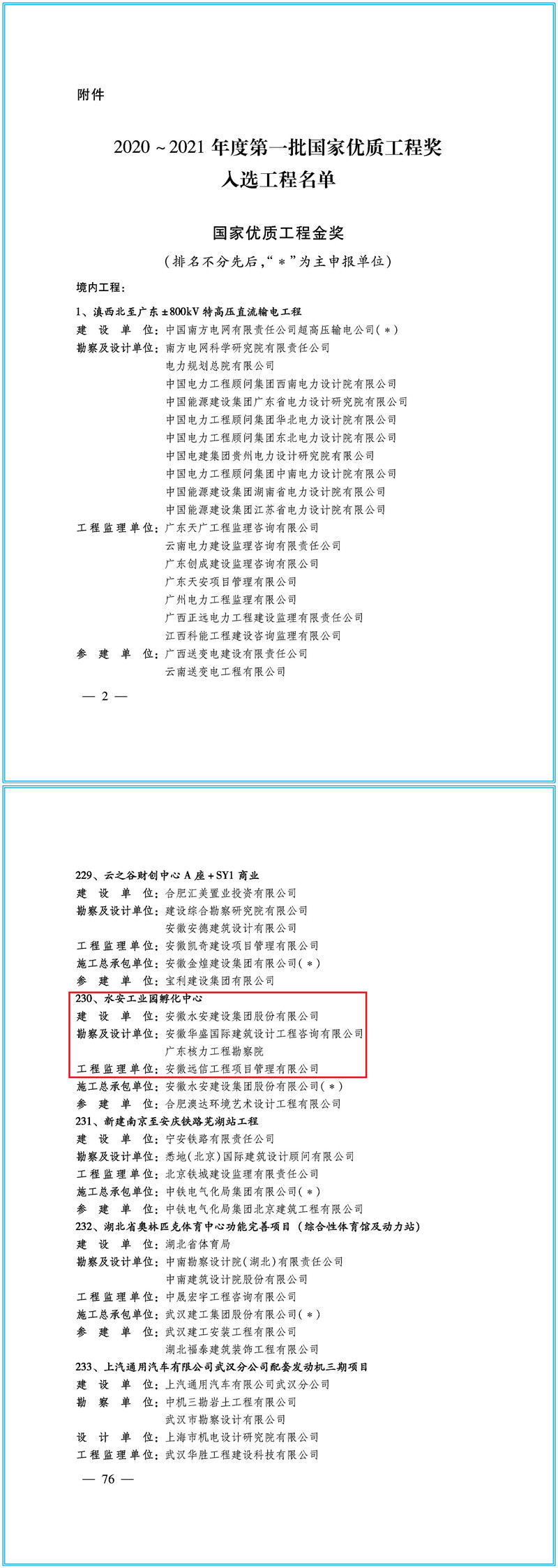 12月1日,中國施工企業管理協會網站公布了2020~2021年度第一批國家優質工程獎入選工程名單,安徽遠信監理的水安工業園孵化中心項目名列其中,獲得國家優質工程獎。這是該項目自2019年度琥珀杯,2020年度黃山杯之后獲得的又一榮譽,也是安徽遠信繼湟中縣巴城城中村棚戶區改造一期及公租房建設項目、中化三建技術研發中心項目之后,再一次斬獲“國字號”殊榮。