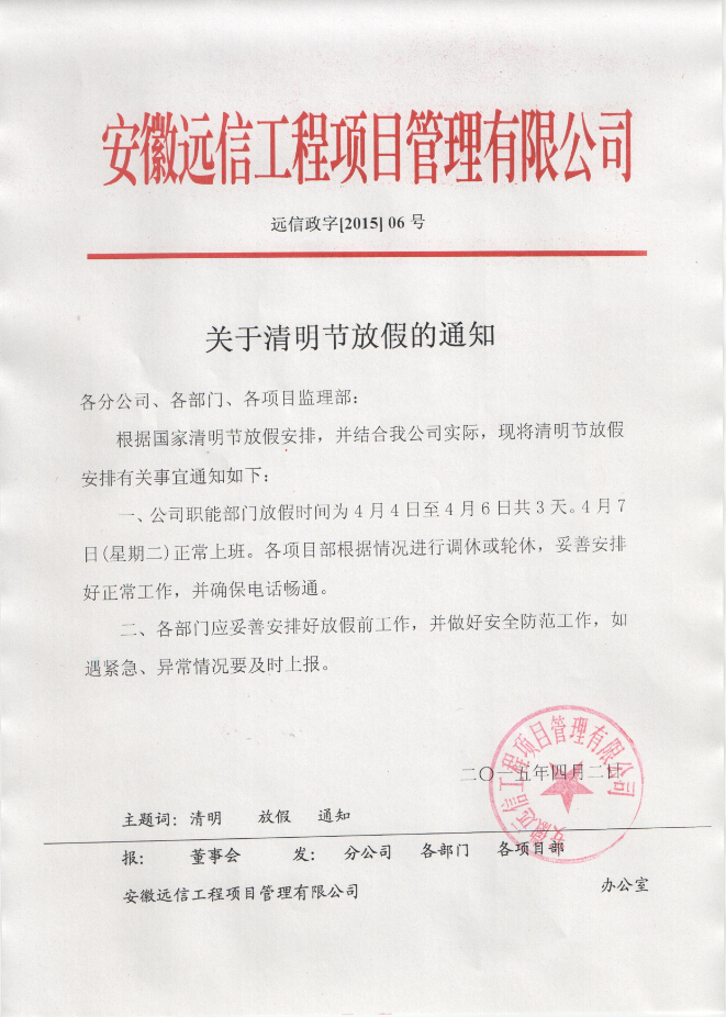 關(guān)于2015年清明節(jié)放假的通知 發(fā)布時間:2015-04-02 閱讀量:3234 上一篇:關(guān)于五一勞動節(jié)放假通知下一篇:關(guān)于2015年元旦放假的通知